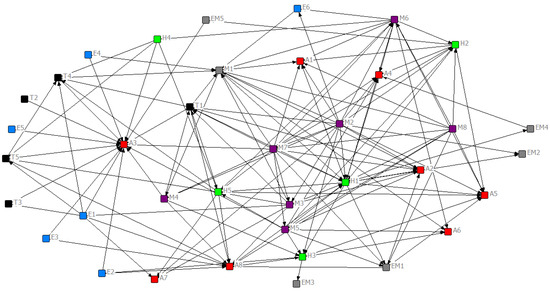 A complex network is an abstract modeling method based on graph theory for complex systems containing a large number of elements. Generally, the elements are regarded as nodes of the network, and the connections between the elements are regarded as edges. According to Formula (4), the 29 safety risks and 8 accident types in subway construction are selected as the nodes of the risk network. The lift can reflect the strength of the correlation between different risks. For example, if the lift between I1 and I2 is two, then when A occurs, the probability that B occurs doubles. Therefore, in all strong association rules, the lift between the antecedent item and the result item is used as the weight of the edge. In this paper, the visualization software Ucinet 6.6 is used to construct the safety risk network topology diagram of subway construction, as presented in Figure 5.