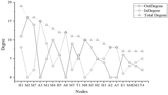Based on the calculated degree values, the degrees of the top 20 nodes are plotted into a distribution as shown in Figure 6. Among the risk nodes, the out-degree values of nodes M2 (improper safety management), M7 (unimplemented safety subject responsibilities), H1 (violation of operation rules), M8 (non-perfect safety responsibilities system), and M6 (insufficient safety education and training) are relatively large, which indicates that these node risks are important in affecting the other node risks. The out-degree value of node M2 is even more than 16, which indicates that the node M2 may result in the emergence of 16 safety risks and therefore should be strictly controlled for the occurrence of M2. On the contrary, nodes M1 (insufficient safety checks or hidden trouble investigations), H5 (inadequate risk perception), and T1 (improper construction methods) have a high in-degree, indicating that these nodes are more susceptible to the influence of other nodes.