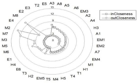 In a risk network, closeness centrality reflects the distance from one risk node to other risk nodes. The larger the value of closeness centrality of a node, the closer it is to other nodes, which reflects the importance of the node. Closeness centrality includes incloseness centrality and outcloseness centrality, and the calculation formulas can be shown in Equations (10) and (11).