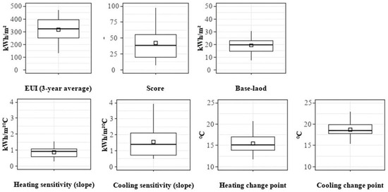 The change-point temperatures in Figure 9 are the results of the physical performance, indoor setpoint temperature, and occupant behavior of the buildings. A building with a high heating change-point temperature compared to other buildings means that it starts heating relatively early. A building with a lower cooling change-point temperature than other buildings indicates that it starts cooling relatively early.