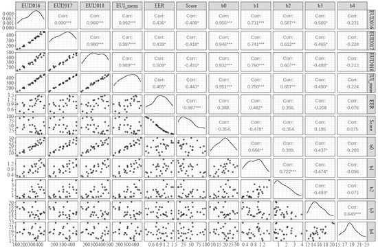 Figure 5 shows the results for the analysis of the correlations between the EPIs. The three-year energy consumption showed a clear correlation. As the EUI increased, the EER tended to increase, and the score tended to decrease, although very clear relationships were not observed.