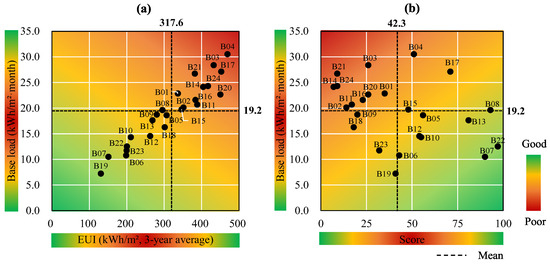 Result of the EUI–baseload vs. the EER score–baseload comparison. (a) shows the EUI–baseload comparison results, and (b) shows the score–baseload comparison results.