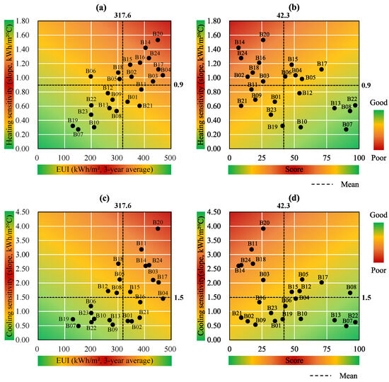 High heating and cooling sensitivity mean that energy consumption increases rapidly with temperature changes, and the related building envelope performance (e.g., thermal performance of the envelope and infiltration) or equipment efficiency needs to be examined. If they are compared with the score, as in Figure 8b,d, it is possible to identify whether the reason for energy-inefficient buildings is related to heating/cooling sensitivity.