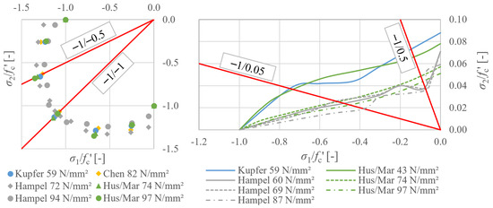 Concrete biaxial strength is usually plotted in a two-dimensional stress space. The stress values () obtained in each loading direction are related to a reference strength (), which is typically the uniaxial compressive strength obtained in the test setup used; see Figure 4. To determine the fracture curve, various loading ratios have to be considered. The load increase in the second load axis is chosen in some proportion to that in the principal compressive direction. As shown in Figure 4, the uniaxial compressive loading (−1/0) and a simultaneous compressive load increase in both load axes (−1/−1) have to be considered for the parameter fitting of the material model. These were also the main support points in determining the fracture curve in the 2D stress space. In addition, the load ratio (−1/−0.5) was investigated, as this shows the maximum strength increase especially for concretes of higher strength [12,13,14,15]. During the parameter fitting, the stress–strain curves of this load ratio can be used to check the material model for stress states that were not specified during the calibration.