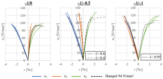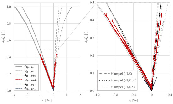 The compressive strain curves in the vertical direction of the uniaxial compression tests and the low transverse strain tests (−1/0.05) show similar stiffness, but failure occurs earlier; see Figure 11 left. As the compressive strength of the Hampel discs is lower this time, the curves deviate somewhat from each other, but the effect of the almost congruent curves for (−1/0) and (−1/0.05) just described is also evident here; see Figure 11 right.