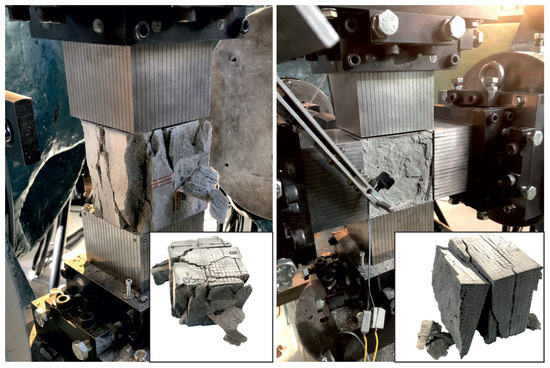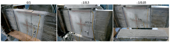 All specimens failed in the form of a smooth crack as shown in Figure 10. The failure point moved towards the edge of the specimen as the tensile stress level decreased and the compressive stress increased. At (−1/0.05), it could be assumed that the adhesive joint failed as the failure occurred very close to the load application. However, the fracture surface in the lower right image shows that it was the concrete body that failed and not the adhesive joint.