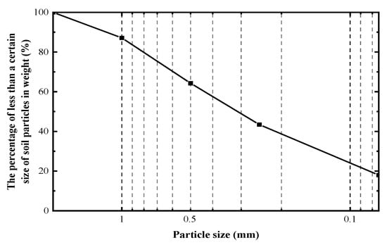 The fluidic silty sand used in this study was collected from an underground site in the Class III channels of the Zhejiang Section of the Beijing–Hangzhou Grand Canal. A screening experiment obtained their grading curve, as shown in Figure 1. Since the density, specific gravity, water content, and liquid plastic limit are the most important physical property indicators of soil, only these indicators of this fluidic soil following the Standard for Geotechnical Testing Method [28] issued by the Ministry of Housing and Urban-Rural Construction of the People’s Republic of China are listed in Table 1. All ratios specified by % in this study are in weight.