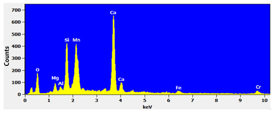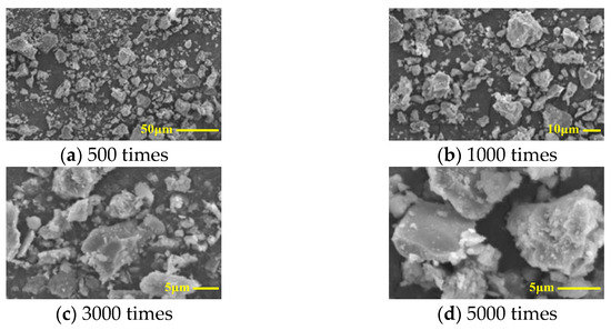 The steel slag used in the indoor tests was collected from a steel slag yard in Ma’anshan, China. It was crushed into a fine powder of less than 0.075 mm. The SEM and Energy Dispersive Spectrometer (EDS) tests were carried out to determine the steel slag’s particle characteristics and chemical composition. As shown in Figure 2, the most abundant elements in the steel slag were Ca and Si, accounting for about 90% of the total in weight; it had fewer amounts of Fe and Mg; and it had the least amount of Al. Figure 3 shows the morphologic characteristics of steel slag particles at different magnifications via SEM. It can be observed that the steel slag was amorphous, and the particle size was extremely uneven. Table 3 lists the chemical components and their contents in weight. Among them, the highest composition in this steel slag was Cao, accounting for 59.2%; SiO2 followed, accounting for 29.1%; and Fe2O3, MgO, and Al2O3 were the least, accounting for 6.5%, 3.9%, and 1.4%, respectively.