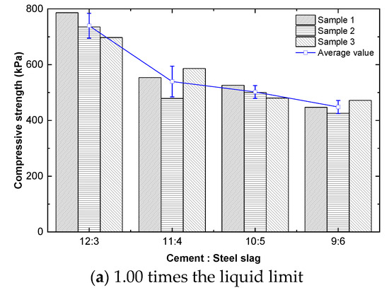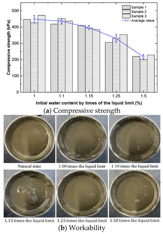Figure 5a shows the strength change in the CSFSS with different initial water contents. It can be found that the compressive strength of the CSFSS decreased with the initial water content. When the initial water content was greater than 1.15 times the liquid limit, the compressive strength of the CSFSS decreased quickly. This change may be because the abundant free water will leave more pores in the soil after evaporating, resulting in slow strength development. Kim et al. [2] and Deng et al. [26] confirmed a similar conclusion that the higher the water content in the soil, the lower the compressive strength. Hence, it should be significant to control the initial water contents of fluidic silty sands before they are stabilized with cement and steel slag. Additionally, when the initial water content was 1.25 times the liquid limit, the workability state of the prepared soil sample was similar to that of the field (Figure 5b), and its compressive strength after stabilization was more than 300 kPa. These characteristics suggested that such an initial water content could better reflect the project’s situation. Therefore, to ensure guiding significance for the project, the subsequent sample preparation shall be completed using 1.25 times the liquid limit.