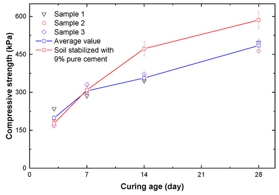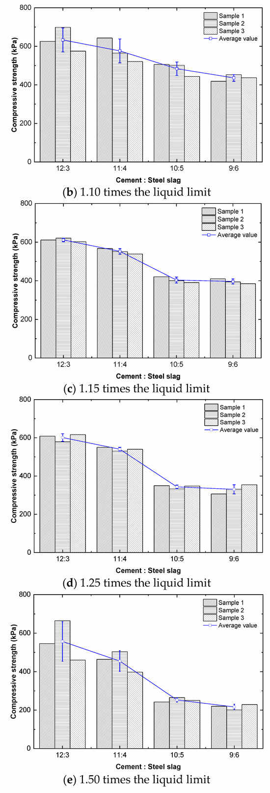 The compressive strengths of cement- and steel slag-stabilized fluidic silty sands curing for 3, 7, 14, and 28 days were investigated to understand their influences. The cement/steel slag ratio was 9:6 in weight, and the initial water content was 1.25 times the liquid limit of the soil.