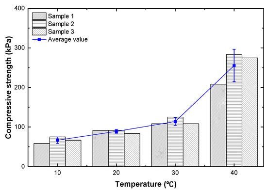 Some studies have shown that the curing temperature significantly impacts the strength improvement of cement-stabilized soils [18,19]. To verify the influence of the curing temperature on the strength improvement of cement- and steel slag-stabilized fluidic silty sand, all prepared specimens sealed with cling film were cured for seven days at temperatures of 10, 20, 30, and 40 °C, and then compression tests were conducted. The cement/steel slag ratio was 9:6 in weight, and the initial water content was 1.25 times the liquid limit of the silty sand.