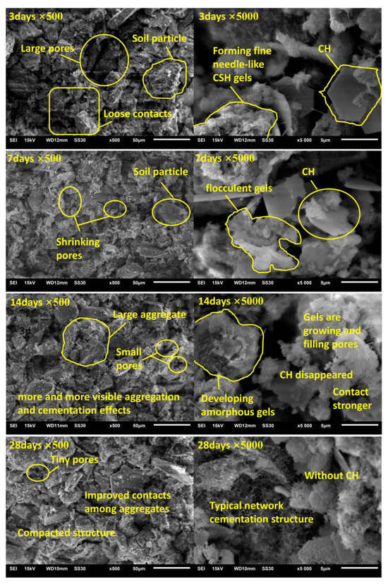 The internal stabilization mechanisms of the CSFSSs were investigated and discussed via SEM images obtained from a JSM-5900LV electron microscope scanner manufactured by Joel Ltd., Tokyo, Japan in 2018. The cement/steel slag ratio was 9:6 in weight, the initial water content was 1.25 times the liquid limit of the silty sand, and the curing ages were 3, 7, 14, and 28 days. When testing, the microstructure characteristics of the soil sample surfaces were captured via zooming by 500 and 5000 times. The microstructure image at the magnitude of 500 times was employed to observe the pore distribution of loose and dense areas on the surfaces of the samples. The microstructure image at the magnitude of 5000 times was used to track the contacts of the soil particles and the evolution characteristics of the gels. Of course, it should be known that these microstructure characteristics were all captured on the local surface of the soil sample, which cannot represent the features of the whole sample due to the inhomogeneity in the soil structure at the microscale and the discreteness of the observation points.