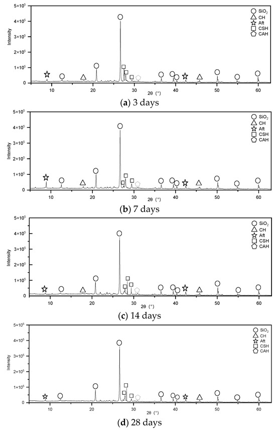 Figure 9 shows the XRD diffraction pattern of the CSFSS with 2θ in the 5–60° range. It can be observed that the diffraction intensity of the CSFSS at the curing ages of 3, 7, 14, and 28 days obviously changed between 15° and 40°. The highest peak of the hump-like structure always appeared with a center of 2θ ≈ 27°. With the development of the curing age, the intensity of SiO2 in the CSFSS gradually decreased. However, it was still the main component in the soil because the fluidic silty sands, cement, and steel slag all contained the component of SiO2. CSH, CAH (calcium aluminate hydrate), Aft (ettringite), and CH products were detected when the curing age was increased to three days [3]. The yield of the CSH gel being higher than that of the CAH gel could be because the active SiO2 content in the CSFSS was more than that of Al2O3. When the curing age was increased to seven days, the intensity of CAH was unchanged, and the intensity of CSH continued to increase. This change meant that the yield of CAH gels had been almost completed because the content of Al2O3 in the cement was limited, and the hydration reaction the cement was still in progress. When the curing age reached 14 days, the intensities of CH and Aft decreased significantly. Theoretically, if the steel slag was not used in the cement-stabilized fluidic silty sands, the intensity of CH as the by-product of cement should be more and more dramatic. However, the intensity of CH in CSFSS was the opposite. It was evident that some substances in the steel slag should react with CH. Namely, the steel slag took part in the hydration reaction of the cement. When the curing age was increased to 28 days, the intensity of SiO2 in the soil was almost unchanged, and the intensity of CSH had not significantly increased, which indicated that the cement hydration and pozzolanic reactions were disappearing [8,26].