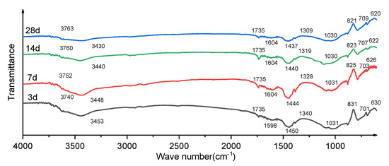 The chemical reaction of the cement-based samples could rapidly develop in the early curing age but slowly developed after curing for 28d. Therefore, this study conducted a more detailed spectra analysis on cement- and steel slag-stabilized silty sand after curing for 3, 7, 14, and 28 days to investigate the influence of adding steel slag to the chemical reaction of cement-stabilized silty sand. Figure 10 presents the infrared spectrum evolution of the CSFSS over the curing age. It could be found that there was a strong absorption peak near 700 cm−1 during the early curing age, which was related to the bending vibration of Al-O [32]. An absorption peak near 630 cm−1 was also observed, which is commonly caused by the symmetrical vibration of zeolite-like atomic groups. With the increase in the curing time, the absorption peak near 620 cm−1 was still obvious, indicating the formation of zeolite-like materials [33]. The strong asymmetric stretching vibration peaks near 831 cm−1 and 1340 cm−1 moved to the lower peaks near 821 cm−1 and 1309 cm−1, which implied that the hydration of the cement was in progress. The 1030–1031 cm−1 absorption bands were the T-O (T is Si or Al) asymmetric telescopic vibrational bands and symmetric telescopic vibrational bands in the tetrahedral zeolite group minerals. This absorption band was caused by the valence vibrations of the Si-O or Al-O bonds [34]. The vibration peaks near 1600 cm−1 and about 3500 cm−1 related to the hydroxyl’s stretching and bending vibrations became obvious over the early curing age, indicating the bound water yield in cement hydration over the curing age [7,35]. The vibration peaks near 3740 cm−1 and 3752 cm−1 at the curing age before seven days suggested the formation of CH. However, these vibration peaks continued to weaken over the curing age. That meant that the CH was gradually decreasing. No new vibration peak appeared again, which implied that the CH was sufficient for the later pozzolanic reactions of silicon–aluminum oxide in the steel slag. This finding was consistent with the relevant research results [36,37].