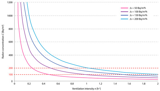 The effect of ventilation on the indoor radon concentration is illustrated in Figure 2. The indoor radon concentration C (Bq/m3) is directly proportional to the radon supply rate Js (Bq/m3h) and is inversely proportional to the intensity of the ventilation n (h−1). Four values of Js (50, 100, 150, and 200 Bq/m3h) were considered in this study. These values were chosen so that, for normal ventilation intensities from 0.1 to 1.0 h−1 [27], they produced indoor radon concentrations [28,29] that could normally occur in new non-basement buildings.
