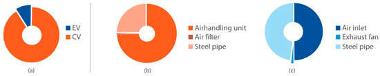 The embodied impacts of the two ventilation systems were compared to understand those that affected the environment the most in the production stage (A1–A3). Based on the EF 3.0 single-score method, Figure 6a shows that the CV embodied impacts (orange) are significantly greater than the EV embodied impacts (blue). The reason for this result is that the emissions associated with the air handling unit and the steel air ducts significantly impact the overall results. Furthermore, Figure 6b,c illustrate the embodied impacts of each component of the CV (orange shades) and EV (blue shades).