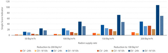 For example, considering a reduction to 200 Bq/m3, for EV 24 h, the EF3.0 single-score values changed from 12.30 for 50 Bq/m3h to 24.24 for 100 Bq/m3h, while for CV 24 h, the values changed, respectively, from 2.30 to 4.45. If considering a reduction to 100 Bq/m3, and 9/15 h, the EV values changed from 9.69 for 50 Bq/m3h to 17.12 for 100 Bq/m3h, while the CV presented values of 1.78 and 3.13.