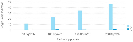 Regardless of the radon supply rate, the CV always had a lower environmental impact than the EV in both operating modes. This makes the CV the more environmentally friendly option, especially when operated in a cyclic mode. For all radon supply rates, it can be observed that the emissions resulting from Eh are much higher than those resulting from Ef (Figure 8). In fact, for a radon supply rate of 50 Bq/m3h, the single score was composed of 94% of Eh and only 6% of Ef. This proportion was similar for all radon supply rates. The impacts of the elimination of heat losses were decisive.