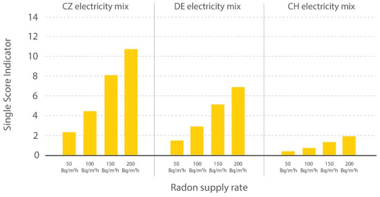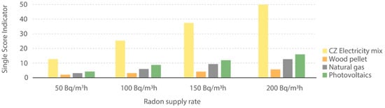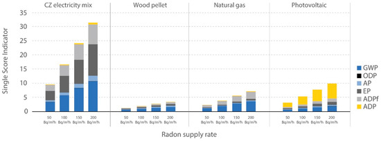 As a part of this stage, the ventilation systems and their environmental impacts were reviewed using the environmental footprint normalization and weighting method (EF 3.0) [23,38]. This method involves normalizing and weighting the results in order to group them into midpoint categories that can be summed up into a single score [39]. It is therefore admissible to use these single-score indicators resulting from the EF 3.0 method for a direct comparison of the performance of different ventilation systems in terms of a single numerical value. The indicators were then compared to identify the most environmentally friendly ventilation system in terms of the radon supply rate.