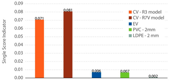Furthermore, the results of this research were compared with Felicioni et al.’s findings [13], where radon-proof membranes (one of the easiest-to-install and cheapest passive solutions for this gas [40]) were analyzed to highlight the type of membrane (chemical composition and thickness) that was the most effective for radon control and environmental effects. Figure 13 shows that passive solutions, such as these radonproof membranes, particularly a polyvinyl chloride (PVC) membrane 2 mm in thickness and a low-density polyethylene (LDPE) membrane 2 mm in thickness, present lower embodied impacts than the ones related to the CV and have comparable values to those for the EV. The comparison took into consideration the results of the EF 3.0 single-score method. It should be added that membranes have no operational impacts.