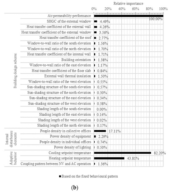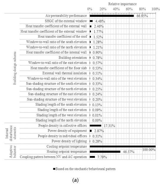 - The cooling/heating setpoint temperature, the air permeability, and the people density of collective offices are critical influencing factors with a relative importance greater than 10% based on both behavioural patterns. Therefore, energy conservation strategies based on these factors are a high priority.