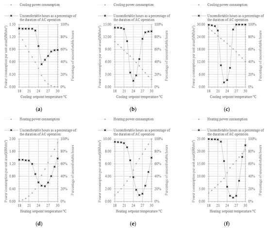 - The effect of implementing key strategies in the case buildings was simulated. Accordingly, the power consumption can be reduced from 52.37 kWh/(m2·a) to 34.03 kWh/(m2·a), while the uncomfortable hours as a percentage of the duration of AC operation decreased from 51.49% to 26.78%, thus achieving 35.02% AC energy savings while promoting thermal comfort.