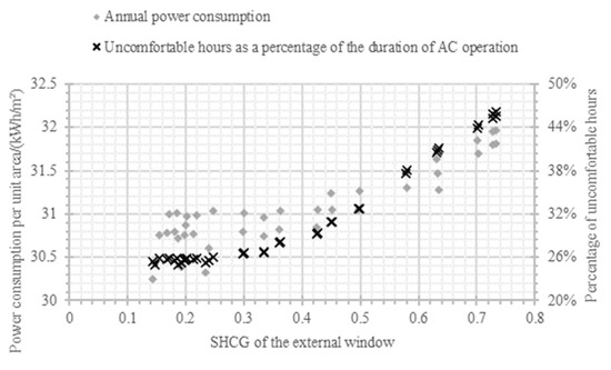 | Simulated thermal comfort | Uncomfortable hours as a percentage of the duration of AC operation | 51.49% | 26.78% | |