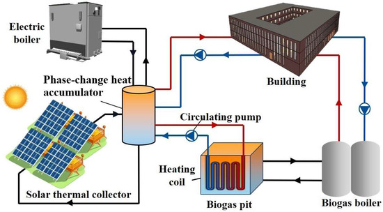 However, due to the low outdoor temperatures in winter, biogas production is insufficient to meet the thermal demands of individual users. Therefore, the integration of other renewable energy systems for auxiliary heating becomes necessary [13,14,15]. Alkhamis et al. [16] coupled solar energy with biogas reactors to provide the necessary heat for biogas production, achieving an internal rate of return (IRR) of 32.7% on the investment in the solar system. Tiwari et al. [17] conducted research on photovoltaic thermal integration systems for biogas heating, demonstrating that the addition of solar energy increased biogas production. Xue et al. [18] integrated a biogas power generation system with an energy-storage system, resulting in a payback time of 4.35 years, which is a reduction compared to traditional systems. In this context, the design of a multi-energy complementary system coupled with biogas and incorporating a heat-storage device becomes a promising approach to ensure system stability.