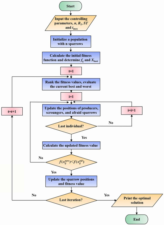 where represents the step size; K represents a random number between ; represent the fitness value of the present individual, the present optimum fitness value, and the worst globally observed fitness value, respectively; and is a constant that approaches 0. The flowchart for SSA is shown in Figure 4.
