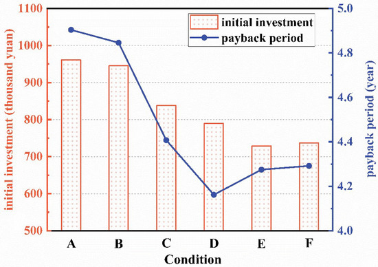 Based on the heating cost of public buildings in Xilin Hot, which is CNY 5.5/m2 per month, the estimated annual heating cost of the office building amounts to approximately CNY 22,588. The equipment selection was carried out based on the optimization algorithm for solar-energy heating and phase-change heat storage, in order to obtain the initial investment under various working conditions. Subsequently, the annual operating cost of optimal scheduling for the balance of supply and demand was calculated under each working condition selection, and the investment payback periods are presented in Figure 6. The results indicate that the initial investment gradually decreases with the considered daily thermal load, while the operating cost decreases due to the utilization of solar-energy collectors and phase-change devices. The payback period of the six working conditions exhibits a tendency of initially declining and then rising. Notably, under working condition D, the investment recovery period is the shortest. In this case, the solar-heating panel covers an area of 677 m2, the investment in the phase-change heat accumulator amounts to CNY 352.64 thousand, and the cost is recovered in just 4.15 years. These results strongly demonstrate the crucial role of considering the balance between supply and demand in reducing initial investment and operating costs.