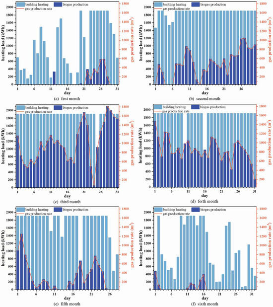 To visualize the energy distribution of a multi-energy complementary heating system, Figure 7 displays the daily amounts of biogas, solar, and electricity used in heating. Additionally, the thermal production above the heat-load curve represents the heat used for biogas production. During the first and last heating months, when there is less heat-load demand, solar energy predominantly provides the heat. This is due to the combination of solar energy and phase-change heat-storage devices, which can meet the building’s heat load throughout the day. In the remaining four heating months, with a thermal load ranging between 2000 kWh and 7000 kWh, most of the solar energy is utilized for biogas production, with a small portion used for building heating. The optimization algorithm is employed to achieve the minimum cost of energy consumption ratio. Under working conditions exceeding 7000 kWh, the amount of biogas heated using solar energy needs to be combined with valley power heat storage and peak power direct supply to meet the requirements of biogas heating and building heat load. In rainy weather, when the work of solar collectors is not considered, valley electric heat storage is used for heating biogas. By considering the coordination of supply and demand, the heat-supply system achieves a rational distribution and optimal operation under multiple working conditions.