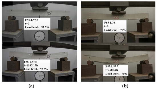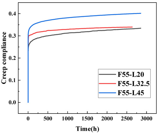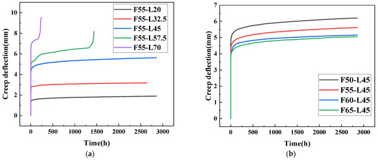 - After establishing a clear definition of the creep stages, a distinct transition point from the primary creep stage to the second creep stage at 300 h can be prominently observed for the load levels of 20%, 32.5%, and 45%. Creep failure is observed in specimens subjected to load levels of 57.5% and 70%, with corresponding failure times of 107.88 h and 9.84 h. As the load level increases, the specimen’s time to failure significantly decreases, indicating that the load level has a crucial impact on the creep behavior of GFRP pultrusion tubes. Furthermore, with increasing load levels, the failure mode gradually shifts from shear failure of the web to overall bending failure. By comparing the time required for Mu to decrease to M and the time required for shear creep of the web leading to shear failure, a reasonable explanation can be provided for distinct failure modes exhibited at different load levels. When the time required for Mu to decrease to match M is longer than the time needed for web shear failure to occur, shear failure takes place. Conversely, when the time for Mu to decrease to match M begins to approach or becomes less than the time needed for web deformation to induce shear failure, overall bending failure occurs.