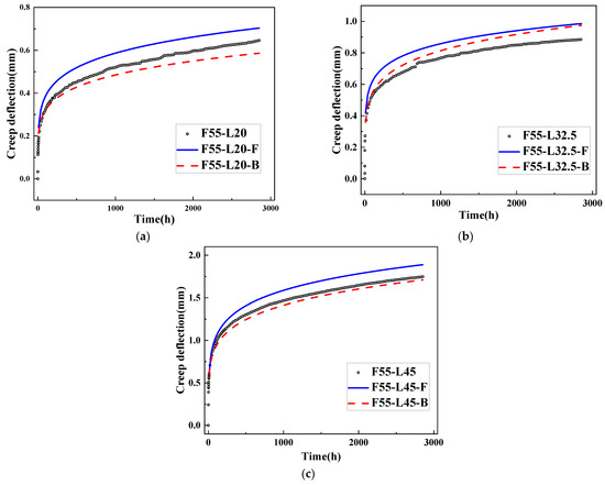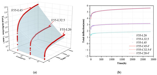 - The results reveal that the creep behavior of the GFRP pultrusion tubes exhibits linear viscoelasticity when the load level is below 45%. In terms of creep deflection, the Findley model exhibits superior fitting performance compared to the Bailey–Norton model for the creep curves at 20% and 32.5% load levels. The maximum error between its total deflection curve’s fitted values and the test values is only 0.4%. This is because the Findley model takes into account not only the deflection changes during the creep stage but also the initial static deflection of the specimens.