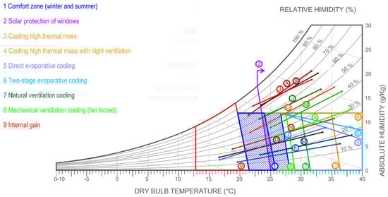This article focuses on a housing typology analysis in the central area, since this is the largest and most populated area (approximately 60% of the country’s population resides here), and it is here that the capital of Ouagadougou lies. It should be noted that data from other locations outside the central area are scarce and frequently need to be extrapolated, because they have more cross-border migration. The central area has a warm semi-arid climate (Bsh), with rainfall concentrated from June to September. During this more humid period, the maximum temperature is lower, as is the daily thermal amplitude. Climate data and design guidelines from Ouagadougou are shown below in a psychrometric chart using Climate Consultant (