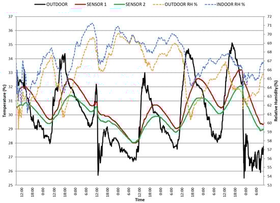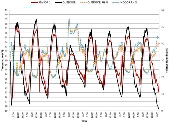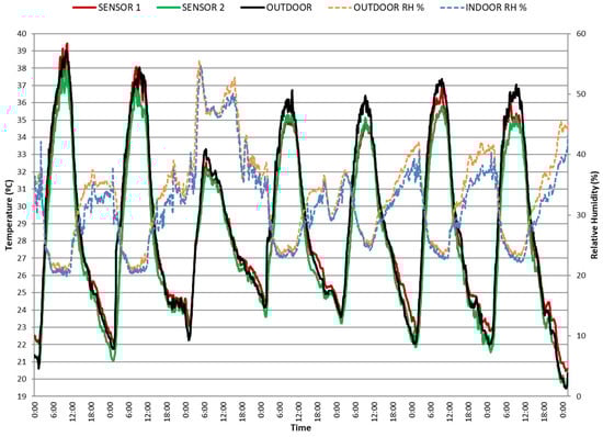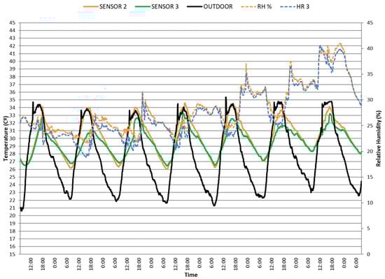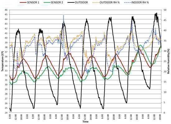 Figure 13), the maximum indoor temperature is even 1–3 degrees higher than the ambient temperature. There is a difference of 2–4 °C between the maximum temperatures registered by the three sensors located at different heights, probably due to the overheating effect of the fiber-cement sheet. However, at night, all sensors reach similar minimum indoor temperatures, because direct solar radiation no longer affects the roof. These minimum indoor temperatures are around 4 °C higher than ambient temperature. Therefore, we assume that night ventilation is not effective enough, and there is a great theoretical cooling potential by increasing night time air flow, for instance by cross-ventilation. Low RH values have been recorded, in a range between 20% and 40%, both inside and outside. On the other hand, the fiber-cement sheet has a very low thermal inertia and therefore heats up very quickly. The graph in