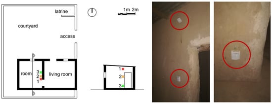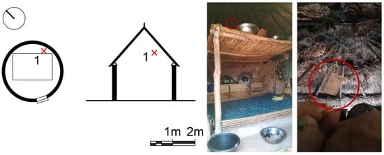 Different case studies of each housing type have been analyzed in situ during our field research, all of them located in the central area of Burkina Faso, which has a warm semi-arid climate. For this article, one example has been selected for each type. These are presented in the following sections. During the houses’ analysis, typological aspects, materials and building systems, ways of life and thermal performance have been discussed. To assess the thermal performance data, loggers were installed in each case study to monitor dry bulb temperature and relative humidity (Onset Computer Models: U12-012, UX 120-006M, TMC6-HD), and data were recorded every 5 min. Data logger U12-012 has the following operating range and accuracy: temperature: −20° to 70 °C; RH: 5% to 95% RH; accuracy: temperature: ± 0.35 °C from 0° to 50 °C. RH: ±2.5% from 10% to 90% RH; operating range of the UX 120-006M: −20° to 70 °C; 0 to 95% RH (non-condensing); launch/readout: 0° to 50 °C. TMC6-HD has a measurement range of −40° to 50 °C in water or soil, −40° to 100 °C in air; response time is minutes typical of 90% in air moving 1 m/s (2.2 mph).