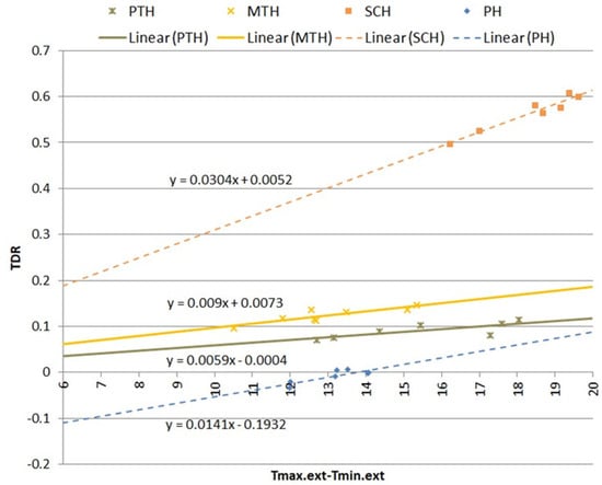 Based on the experimental results, the equations that predict the TDR in each case are listed below: