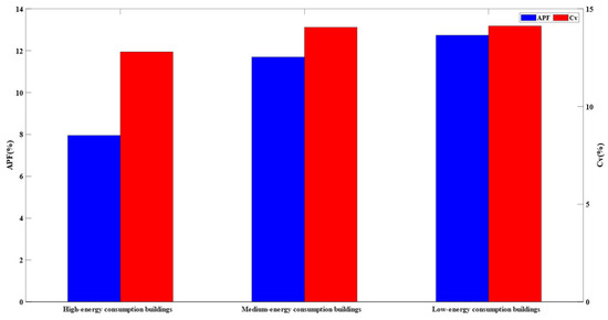 As shown in Figure 2, the APF of high-energy consumption buildings, medium-energy consumption buildings, and low-energy consumption buildings is 7.95%, 11.7%, and 12.74%, respectively. Meanwhile, the Cv of the three building categories is 12.80%, 14.06%, and 14.12%, respectively. The description trend of time series fluctuations for the three buildings, when using APF and Cv, is consistent: both decrease with an increase in building energy consumption. This also indicates that the higher the energy consumption of a building, the smaller its fluctuation.
