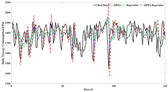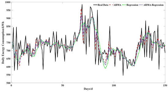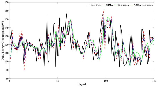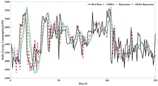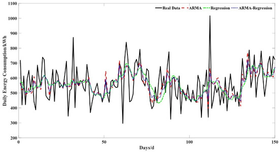 As shown in Figure 6, the prediction results of the second typical building of the medium-energy consumption buildings are presented. The average daily energy consumption of the building is 727.24 kWh/d. Compared with the data from 50 days to 150 days, the real data of the first 50 days is stable, and the peak-to-trough span is smaller. Thus, the LR model performs better than the ARMA model in the initial days. It was found that, from 50 days to 150 days, the ARMA model performs better than the LR model in detecting seasonal trends. The ARMA-LR model can neutralize the advantages and disadvantages of the two models and obtain a prediction result with a relatively stable error.