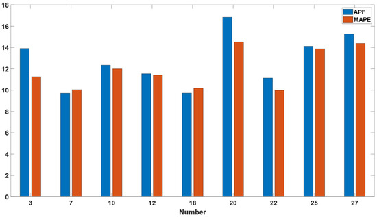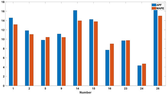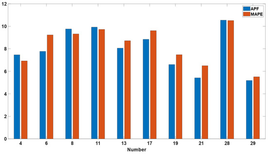 Figure 9, Figure 10 and Figure 11 present the comparison results of the APF and MAPE of the ARMA-LR prediction model for the three building clusters. Among them, the horizontal axis of the graph represents the statistical sequence of each building within 29 buildings. It is interesting to find that the APF result is very close to that of the MAPE. Within medium-energy consumption buildings and low-energy consumption buildings, the APF is a little larger than MAPE. For high-energy consumption buildings, the APF is generally smaller than MAPE.