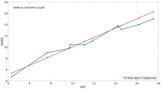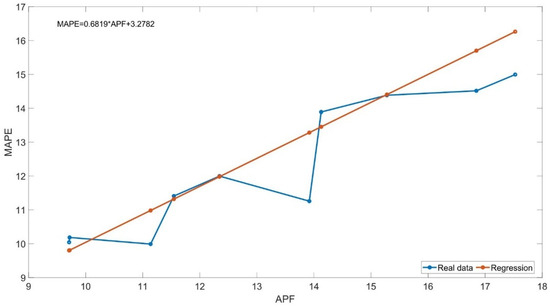The relationship between MAPE and APF for different types of buildings is obtained by using a univariate LR. Within three building clusters, the relationship between APF and MAPE is expressed in Equations (7)–(9), respectively. represents the fitting degree of the LR equation (Equation (10)), the of the high-energy building is 0.8671, the of the medium-energy building is 0.9318, and the of the low-energy building 0.7527.