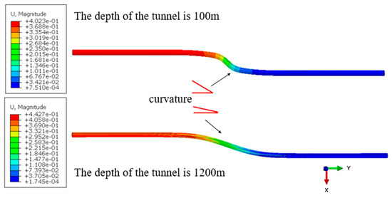 - Regarding deformation patterns, deep-buried and shallow-buried tunnels exhibit an “S”-shaped deformation characterized by bending near the fault slip surface. However, in shallow-buried tunnels, the degree of bending is more pronounced than in deep-buried tunnels. Specifically, shallow-buried tunnels experience significant deformation, albeit within a narrower distribution range, while deep-buried tunnels display a broader distribution of deformation and more extensive damage.