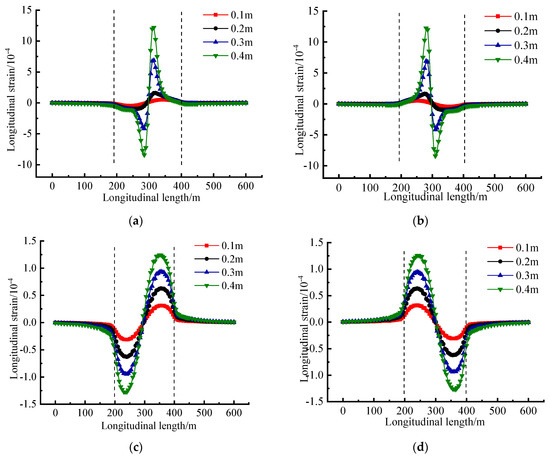 - In terms of strain distribution, the damage of the tunnel is mainly concentrated near the middle of the fault zone. After the tunnels experienced strike-slip fault movement, the shallow-buried tunnels showed similar strain patterns to the deep-buried tunnels, but their strain peaks’ locations differed. However, the damage in the shallow-buried tunnels mainly concentrates near the fault-dislocated surface, whereas the damage in the deep-buried tunnels spreads more widely throughout the fault zone.