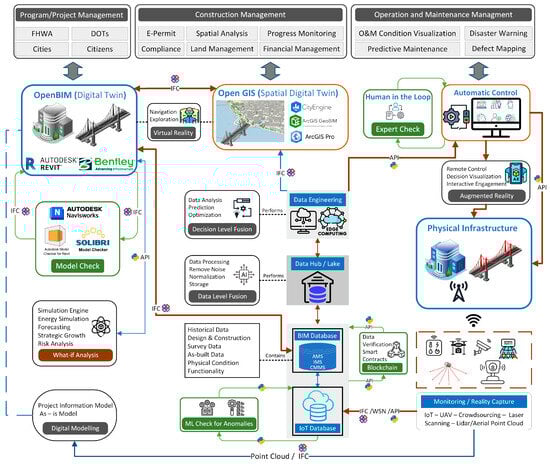 - Jang, K.; Kim, J.W.; Ju, K.B.; An, Y.K. Infrastructure BIM platform for lifecycle management. Appl. Sci. 2021, 11, 10310. [Google Scholar] [CrossRef]