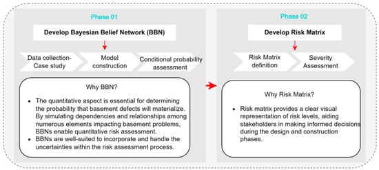 The study sought to quantify the probability of basement defects based on their underlying risk factors; assess the risk levels associated with these defects, considering both their likelihood and severity; and provide a structured framework for risk-informed decision-making in basement systems, emphasizing the importance of reliability and maintainability. As a result, the study employed Bayesian Network and risk matrix methodologies to examine defect probabilities and assess the risk levels associated with building basement defects. The research process involved two key phases, as illustrated in Figure 1, each serving a distinct but complementary role. These phases were essential for developing a comprehensive risk-informed, reliability-driven model, particularly focusing on evaluating basement defect probability using a BBN.