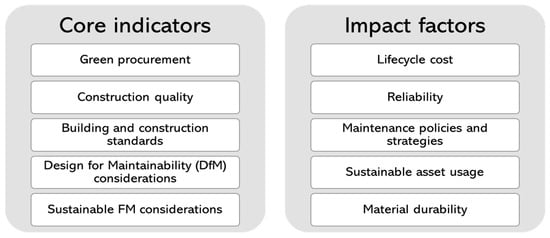 The proposed risk assessment process using the developed BBN involved the identification of model variables based on factors derived from previous research [], involving selecting factors that have a significant impact on building defects. As adopted from previous work [], a set of factors were identified based on their relationship strength and prominence (Figure 2). A set of “core indications”, which significantly affect other variables in the problem space (i.e., independent variable), and a set of “impact factors”, which can only be altered through impacting other criteria (i.e., dependent variable), were used. Accordingly, basement system component durability and reliability outcomes (Table 2) were elicited based on design for maintainability considerations (Table 3). Basement systems were selected in this instance stemming from the interest of recent studies [] highlighting the importance of developing risk appraisal systems for such building systems.