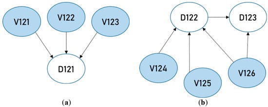 Here, the node identifiers starting with V refer to the variables identified from the basement maintainability benchmarks while D refers to the defects. For example, the independent critical criteria ‘building and construction standard’ is causally linked with the dependent critical criteria ‘reliability’ in this manner. These relationships are graphically represented in what are known as direct acyclic graphs (Figure 3).