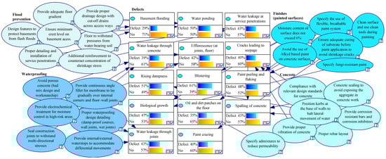 In the developed BBN, the root nodes are defined to include whether there is zero compliance, moderate compliance, or else full compliance with the basement maintainability benchmarks. This determines whether or not there is a flaw in the target nodes, which represent the defects. Once network topology was established, the conditional probabilities were computed based on case study data gathered from 95 buildings for a five-year period, quantifying the causal dependencies for every node there in the network. This could then enable the displaying of the probability distribution of a child node whenever its parents’ likelihoods were given. The greatest likelihood for every condition of such defect nodes as determined by the Bayesian network is presented for every target node (Figure 4). The basement system’s entire network topology has twenty-six independent root nodes as well as fourteen dependent target nodes.