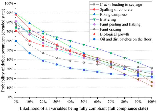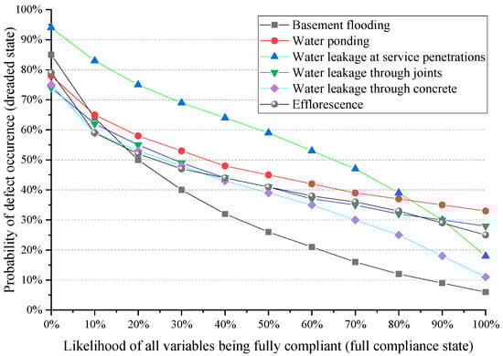 A scenario analysis was used to test whether the structure of the BBN as well as outcomes behave coherently in fictitious risk scenarios. Various scenario analyses were indeed employed to support the operational validity of said BBN (see Figure 5 and Figure 6). When the probability of each independent node being true is enhanced by 10%, the defect probability distribution gets observed in this situation. The predictive capability of the model is evaluated in both typical and abnormal circumstances by observing the changes there in posterior probabilities. This exercise demonstrates the applicability of the model as well as verifies that the produced models are structurally sound. In this instance, a significant decrease in the possibility of all basement problems occurring can be seen with a rise in the likelihood of complete compliance to basement maintainability criteria (see Figure 5). In this exercise, the probability of “partial compliance” is deemed to be 0%.