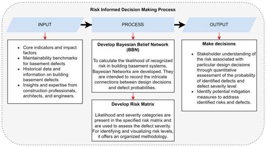 A novel approach is adopted in this study in predicting future operational defects based on the initial design alternatives to anchor the quantitative risk analysis technique using Bayesian networks. The Bayesian networks are developed to identify the probability of the identified defects (risk), and the risk matrix helps to evaluate the defects and their severity. Finally, the risk-informed, reliability-driven decision support system for building basements combines the power of BBNs and risk matrices to provide a structured, data-driven approach to risk assessment and decision support. The proposed BNN-based risk assessment matrix demonstrated its contribution to basement risk prediction and assessment. Further, the diagnostic analysis can also be used as a tool to identify mitigation measures. It may be useful to extend the application scope of the BNN to cover additional building elements and to use the BNN for overall risk diagnoses to enhance the lifetime of building components. This approach provides a comprehensive understanding of basement defects and their root causes, enabling engineers to address issues at their source for more effective, long-term solutions. Further, this empowers facility engineering and management teams to predict maintenance needs accurately, minimizing unplanned downtime and operational disruptions. This approach informs a reliability-based, risk-informed framework for architects, engineers, contractors, and facility managers to enhance project efficiency and communication.